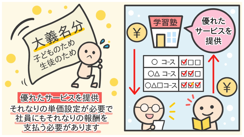 塾業界でこういうことを話すと「営利的に物事を考えすぎだ」と言ってくる人もいますが、「価格に見合うサービスを提供すること」はビジネスの基本です。